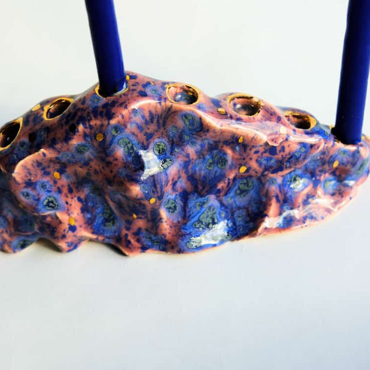 Maya Yadid’s practice delves into the central role played by food in the Jewish diaspora. For Hayom she created Judaica ceramics that are inspired by the action of kneading the challah bread, a tradition passed from generations in many Jewish families. By handling the clay roughly, as if it was the delicious Shabbat dough, she creates Judaica objects that are deprived of any straight line, echoing diasporic histories and paths.